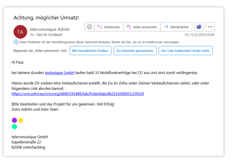 Der zugeordnete Vertriebsmitarbeiter bekommt jetzt eine System-Mail und/oder ein PopUp, dass für Ihn eine Verkaufschance (z.B. „45 VVL Vodafone“) für den Kunden XY GmbH erstellt wurde. Zusätzlich kann dann individuell festgelegt werden, dass z.B. der Vertriebsleiter informiert wird, wenn in der Verkaufschance 2 Wochen lang keine Aktivität stattfand und diese somit nicht bearbeitet wurde.