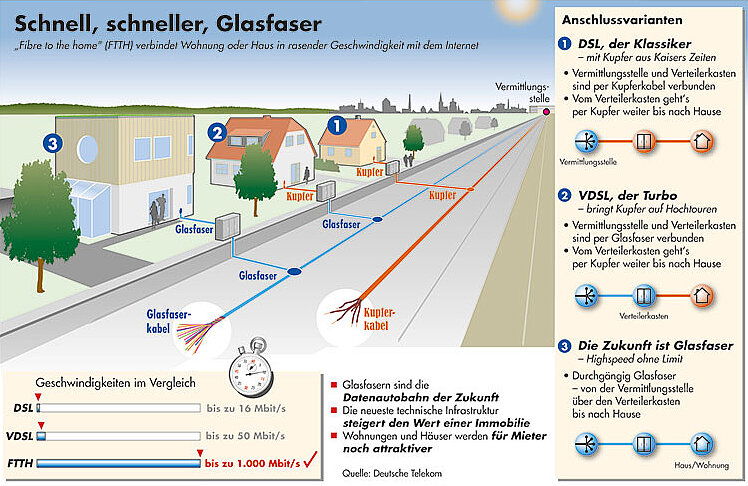 Zu Missverständnissen führt auch mancherorts die Tatsache, dass hinter dem kommunal-mitgeplanten Glasfaserausbau lediglich die Versorgung und Erneuerung des Verteilers in der Straße geschieht und nicht die Glasfaser ins Haus hineingelegt wird. Man erreicht dadurch maximal SVDSL250Mbit/s – und arbeitet weiterhin auf Kupfer-Doppelader. So zu sagen eine wesentlich günstigere Kompromisslösung, bei der die Kunden wenigstens eine höhere Bandbreite erhalten und die Verkabelung nicht ändern müssen.