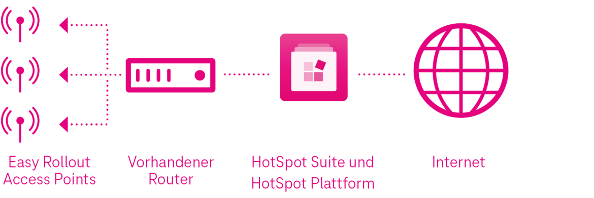 Sie erhalten vorkonfigurierte Access Points für Ihren vorhanden IP-Anschluss. Diese stellen automatisch die sichere Verbindung zur HotSpot Plattform der Telekom her. Der Preis für HotSpot mit dem ersten Access Point beträgt 27,95 Euro/Monat, jeder weitere Access Point kostet 10 Euro/Monat.