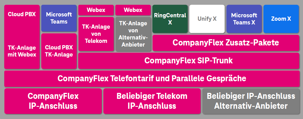 Die Telekom hat das Produkt „SIP-Trunk“ seit längerer Zeit aus dem Vertrieb genommen, weil die beiden Voice-Plattformen für „SIP-Trunk und DeutschlandLAN Cloud PBX“ auf eine neue technologisch ausgereifte Plattform zusammen gelegt sind, bzw. die Altprodukte mit der Zeit migriert werden. Der gemeinsamen Zugang vereinheitlicht die Administration. Und dieses neue Produkt nennt sich CompanyFlex.